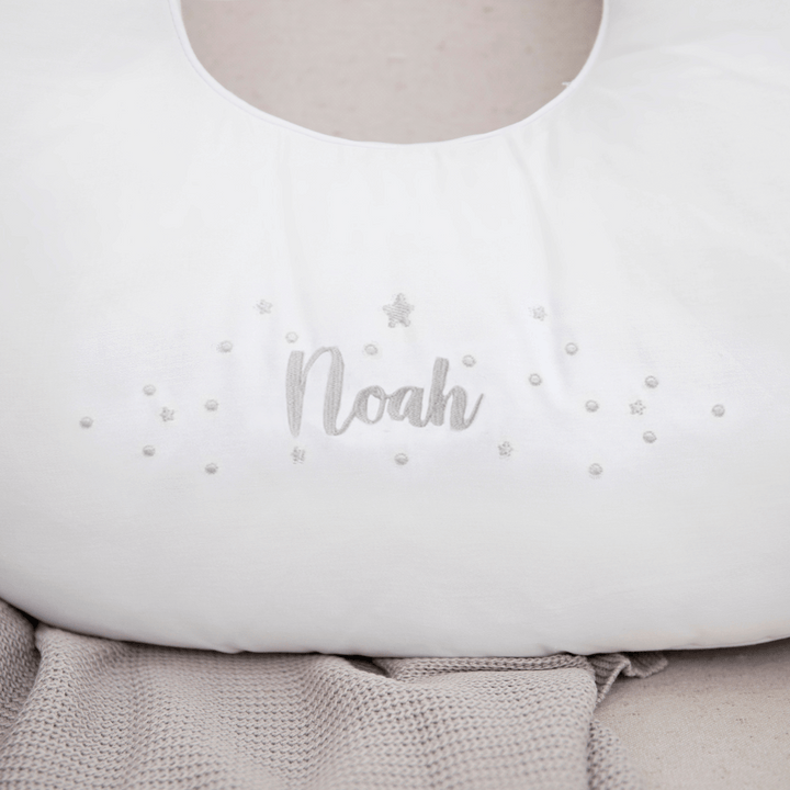 Made from 100% cotton 300-thread-count percale, a personalized nursing pillow combines comfort, sophistication, and a special touch of affection: you can embroider your baby's name, creating a unique and unforgettable piece.