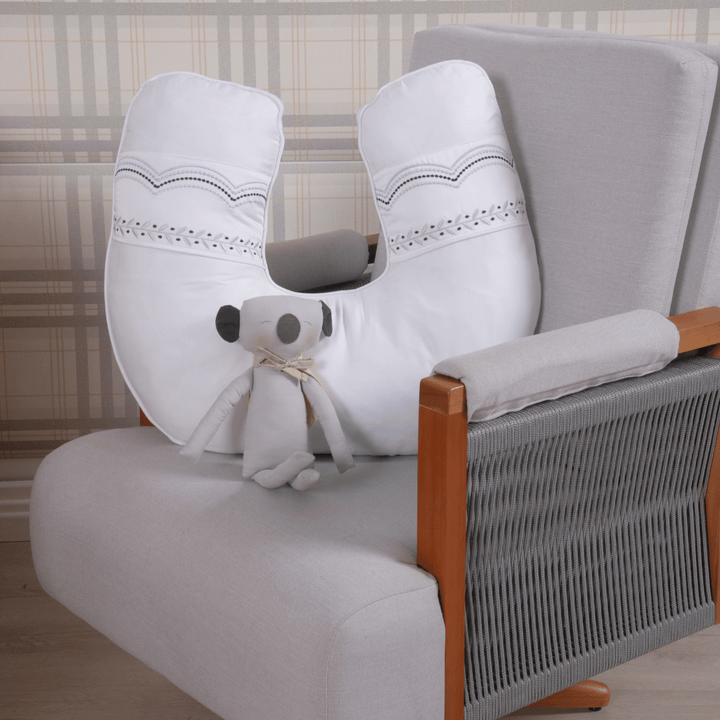 Your sophisticated design with embroidered details adds a special charm to the trousseau, while the removable zippered cover ensures practicality in cleaning. Furthermore, its anatomical shape helps reduce tension on the mother's arms and shoulders, promoting greater comfort during breastfeeding.