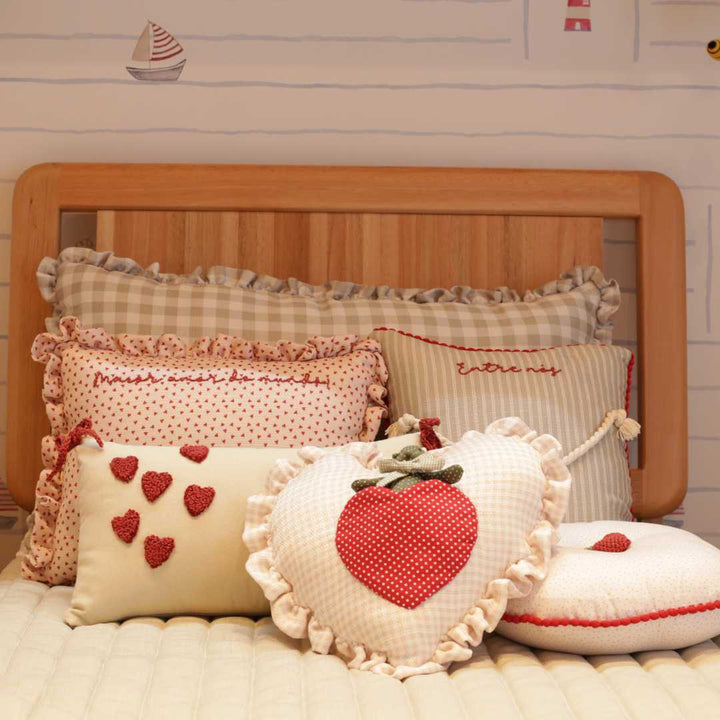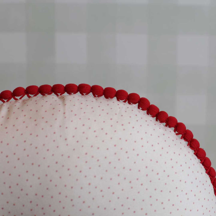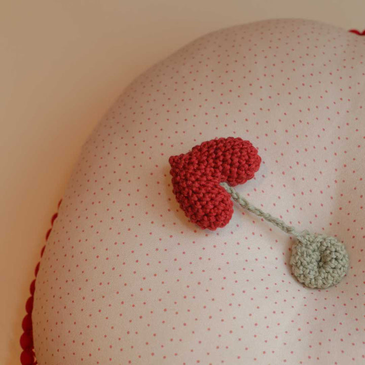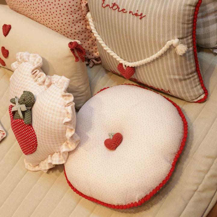 Love is a never-ending cycle—and this pillow conveys that feeling with form and poetry. The Circle of Love Pillow features a round, soft, and delicate design with a polka-dot print, red accents, and a crocheted heart blossoming from the center, like a flower bud born of affection.