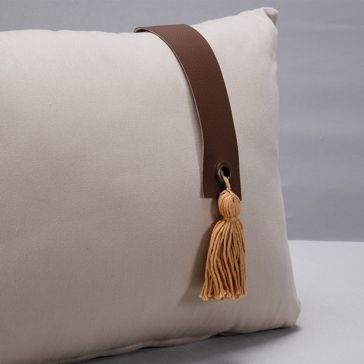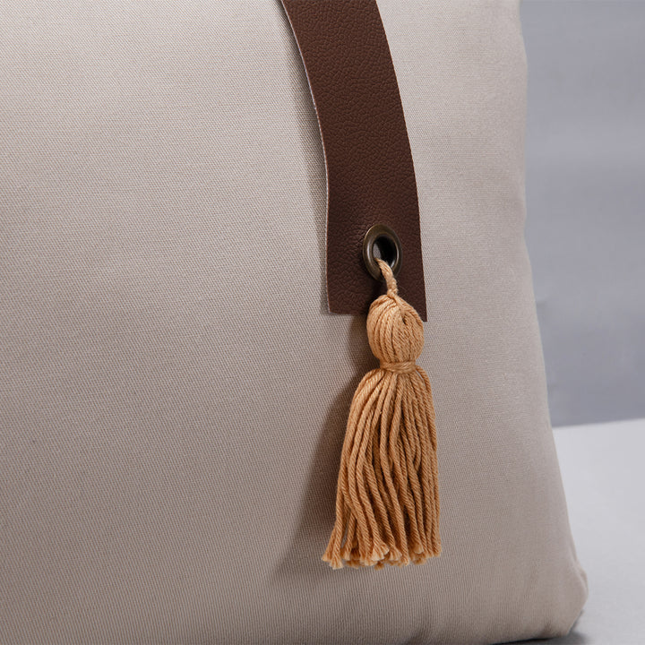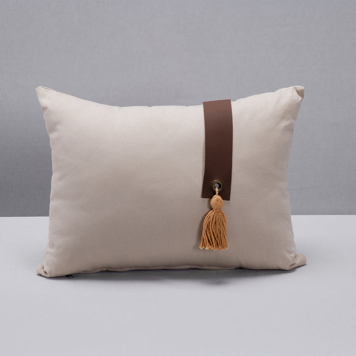 Made from 100% polyester fabric in a soft beige hue, the pillow stands out with its brown leatherette stripe and delicate mustard tassel—a detail reminiscent of old suitcases and the small treasures found along the way. It's the kind of detail that makes a difference: simple, yet full of intention and affection. 🚗🏞️🧡✨