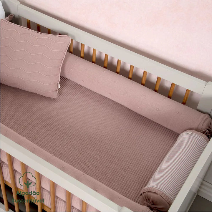Crib bumper roll set made of knitwear with sustainable cotton yarn, featuring a pink polka dot weave . Perfect for protecting your baby in the crib. Accompanying the most beautiful stage of your life, we use high-quality materials that reduce environmental impact.