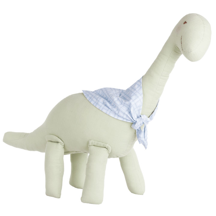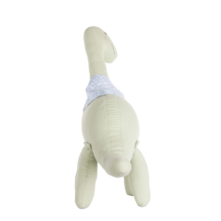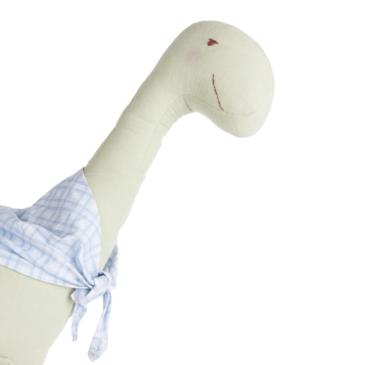 The Big Aqua Green Dino is a charming and personality-filled toy, perfect for decorating your little one's room and becoming their best companion on adventures. Made from soft synthetic linen fabric with embroidered details and a charming blue plaid scarf , this dinosaur combines a delicate design with a nostalgic touch of traditional rag dolls.