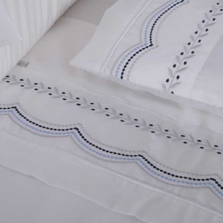 3-Piece Crib Sheet Set, 400-Thread Percale Cotton, Serenité Baby Blue Embroidery