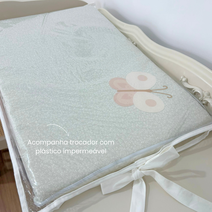 Made from 100% polyester , the kit combines practicality with the collection's poetic aesthetic, with soft details in pastel tones, embroidery and exclusive prints from Jardim da Mamãe.