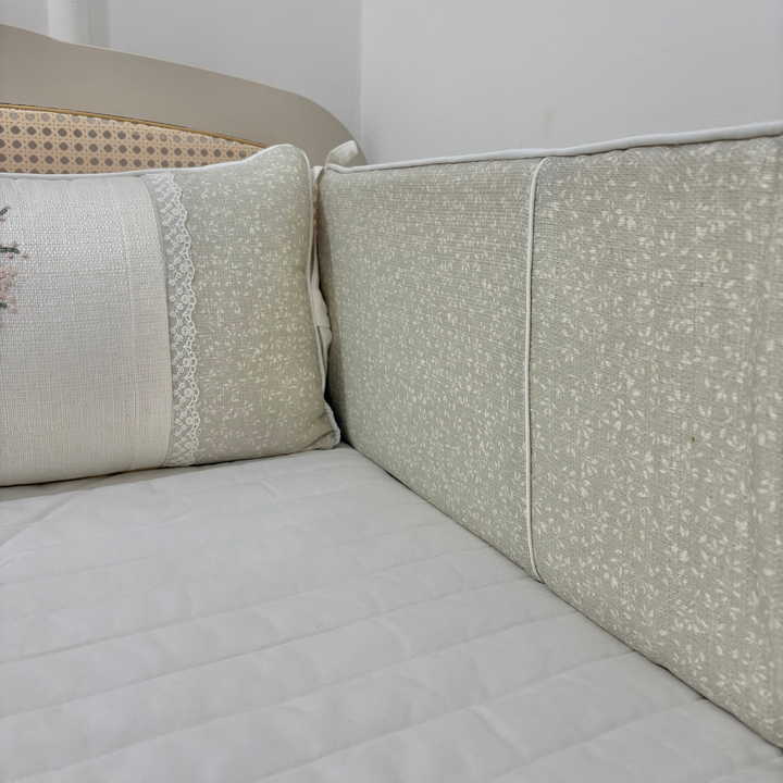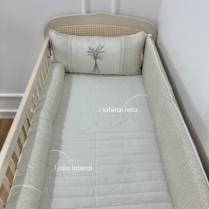 A continuous backrest, ideal for complete protection of the crib's back. Delicate print and soft touch, with a structure that offers safety and a harmonious look. -