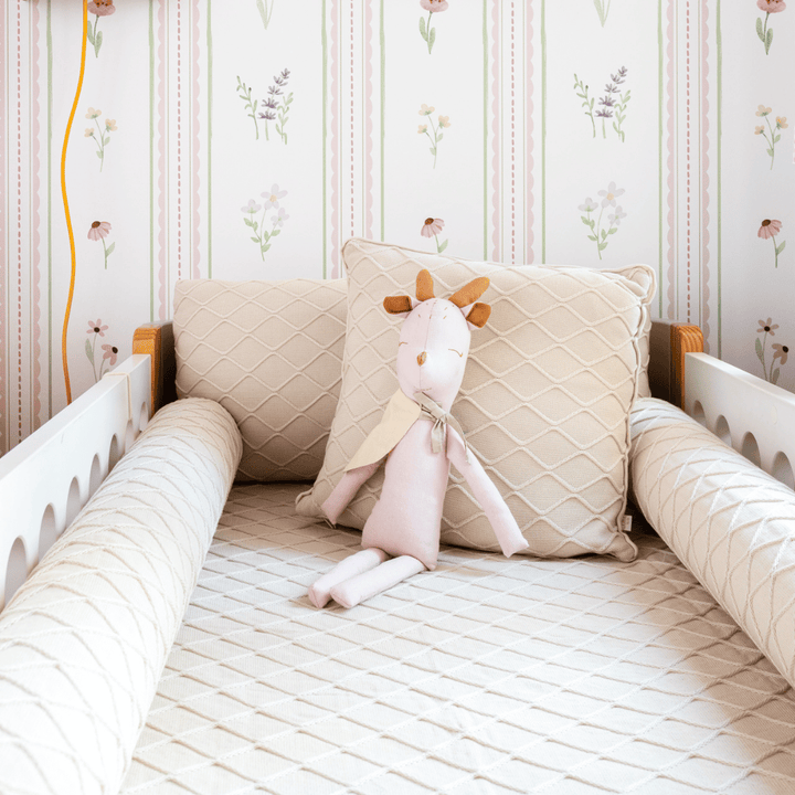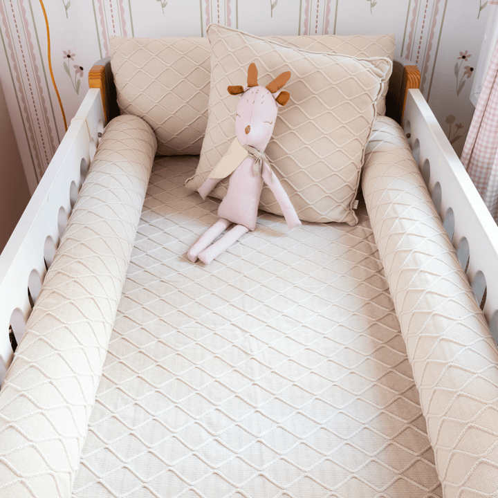 This Almond Milk cotton knit crib set was carefully designed to wrap your baby in comfort and protection from the very first days. The Almond Milk color offers an elegant, neutral, and timeless look, creating a serene and welcoming atmosphere in your baby's room.