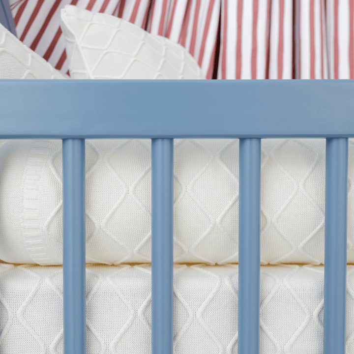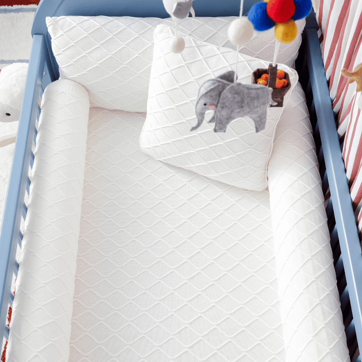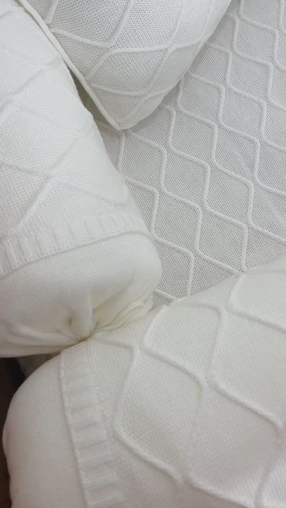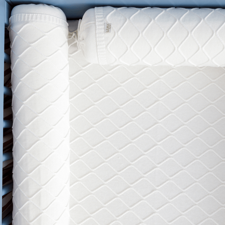 The Cozy Cottage Cream cotton knit crib set consists of six coordinated pieces , meticulously crafted to provide comfort, protection, and beauty . The sustainable cotton knit offers a soft, breathable, and hypoallergenic texture, ideal for gently and carefully wrapping your baby. The cream color adds a touch of elegance and harmony to the room, creating a calm and welcoming space.