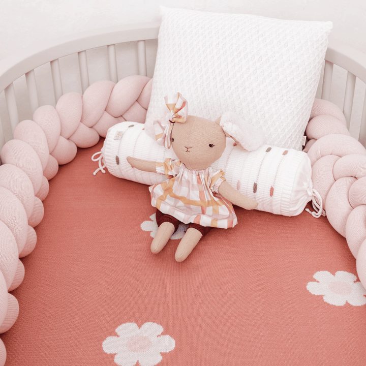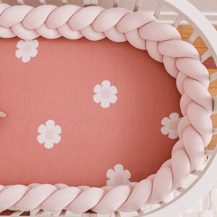 Each piece is carefully crafted from 100% sustainable cotton knit , ensuring softness, durability, and environmental responsibility . The Coral Pink hue, with delicate floral details, brings a feminine, soft, and charming touch to your baby's room.