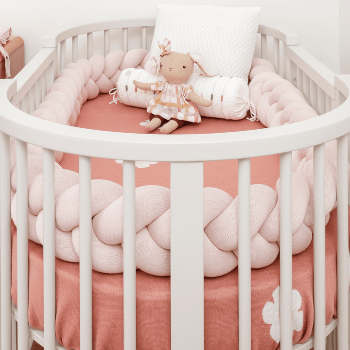 The Coral Pink Margot Crib Kit combines beauty, comfort, and safety in one product. Each piece is designed to provide protection, warmth, and a sophisticated decorative touch , creating a peaceful and charming environment for your daughter.