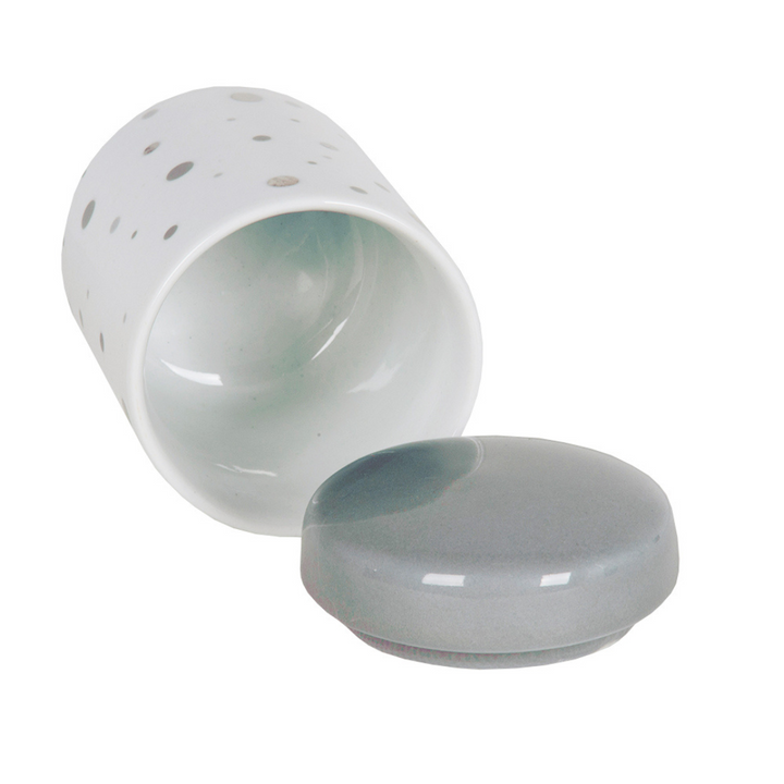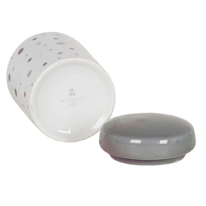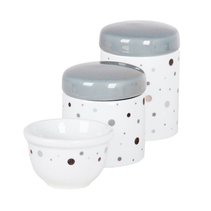 The Gray Polka Dot Toiletry Kit is the perfect choice for families who love a modern, delicate, and timeless style. Comprising three pieces of high-quality porcelain, this set offers a soft, contemporary look with gray polka dot prints on a white background and enameled lids in a serene gray hue.