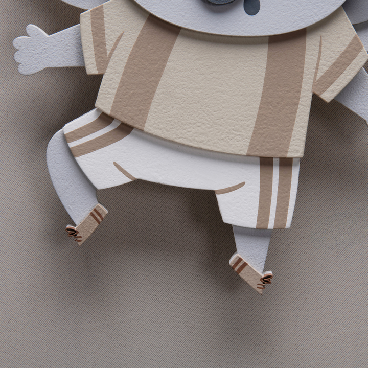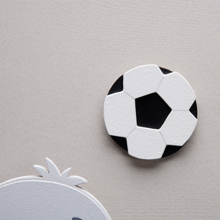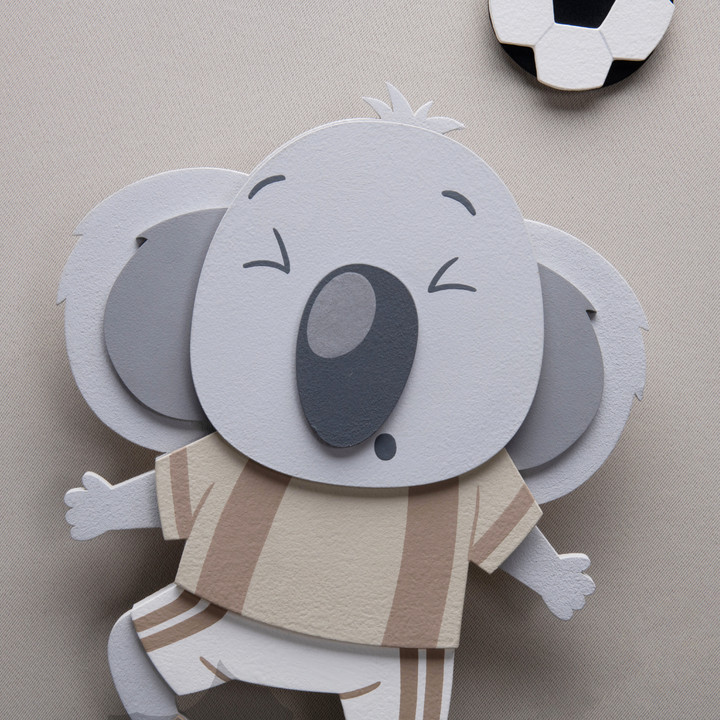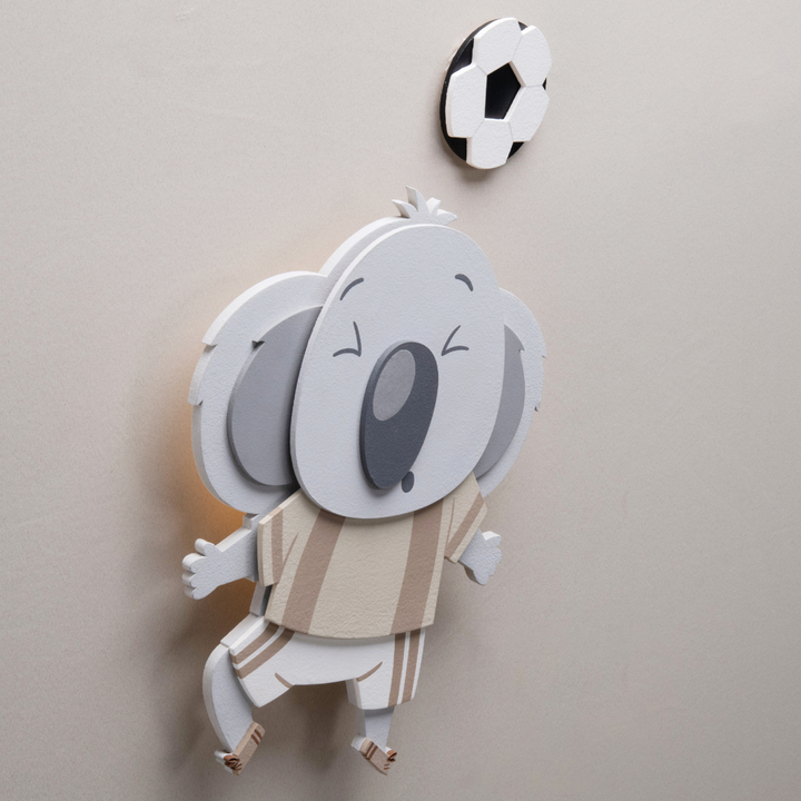 Made of 100% MDF , this piece features a playful and delicate cutout of a stylized koala wearing the Futbaby collection uniform and performing a charming nod. The soft lighting, carefully applied behind the piece, magically outlines its silhouette, creating a light effect that warms the room and soothes little ones.