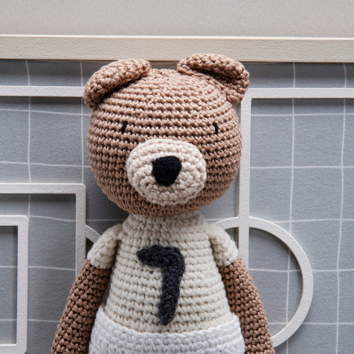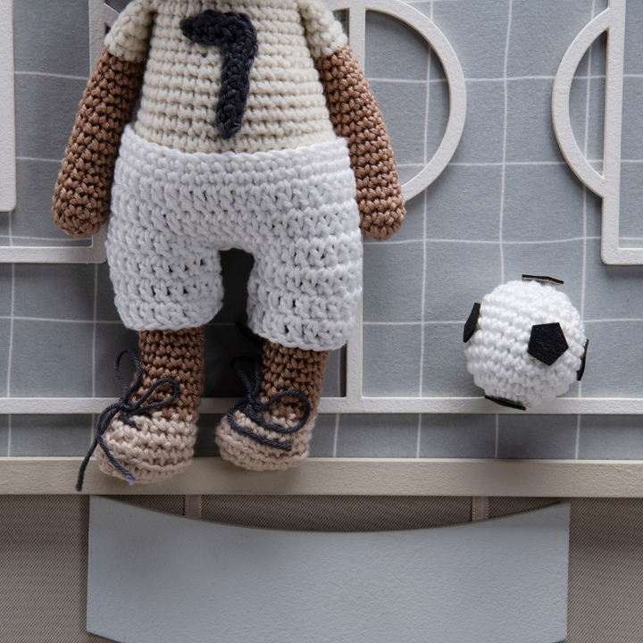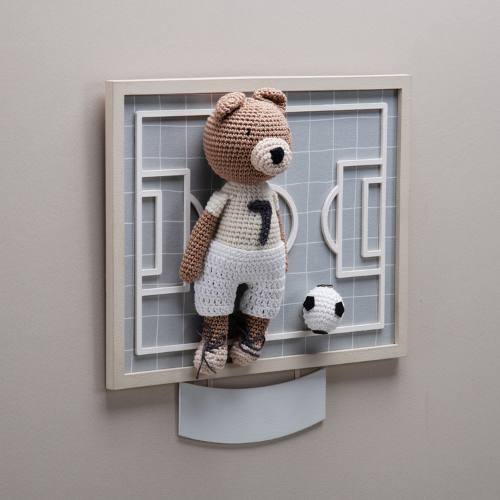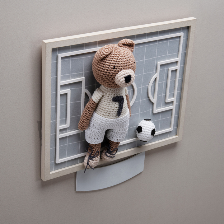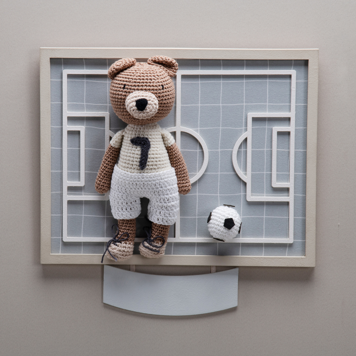 Made of 100% MDF , the piece features a background illustrated with a field design and a handmade amigurumi bear wearing his number 7 uniform, ready for the perfect kick. The ball at his feet and the wooden plaque for personalization make this composition even more special.