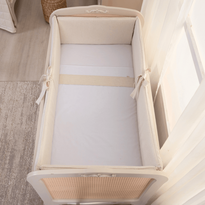 More than just a layette item, this kit was designed to be an extension of your care. Composed of four pieces in 100% cotton linen, it offers effective protection against crib rails while also wrapping your baby in comfort and softness. Secure ties make it easy to use daily, ensuring stability and peace of mind for a good night's sleep.