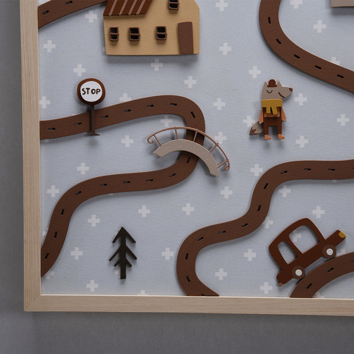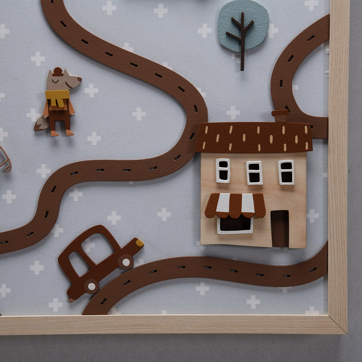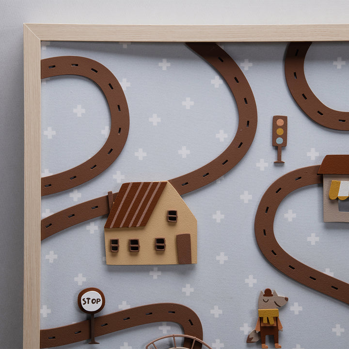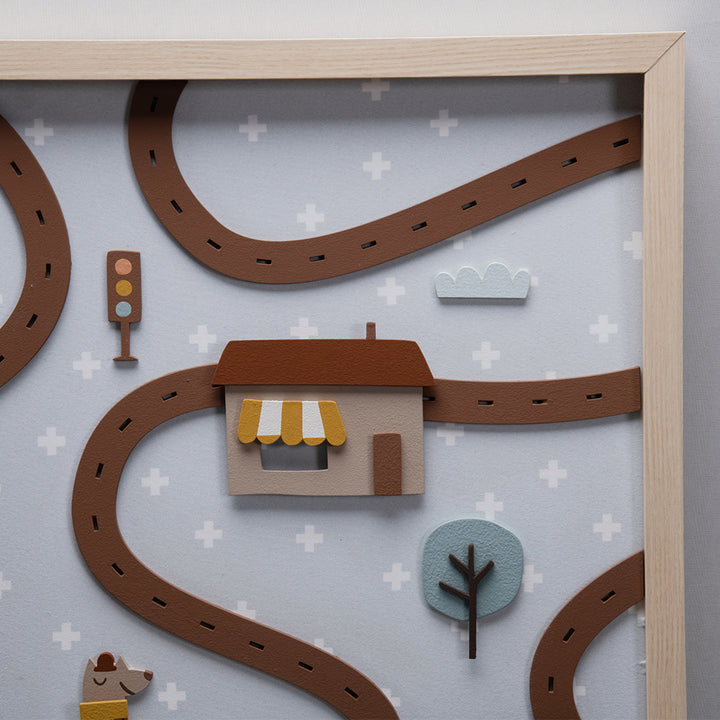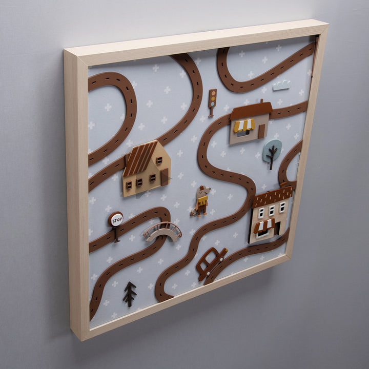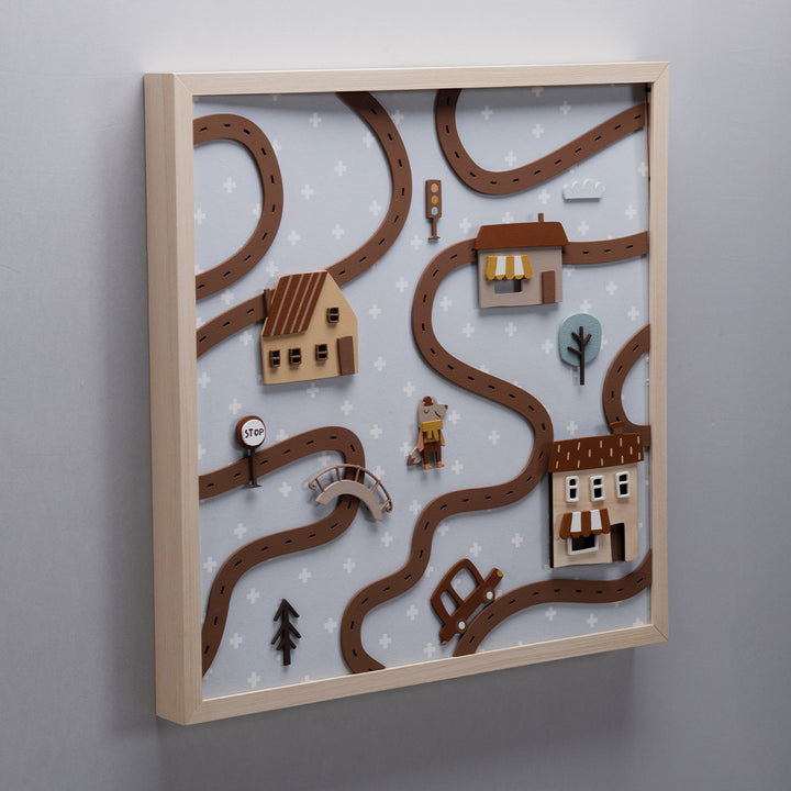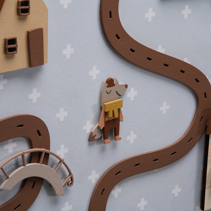 The Magic City Painting is a high-relief piece, made 100% of MDF, that transforms any wall into a true enchanted scene. With charming little houses, traffic lights, railroad tracks, trees, and a friendly animal strolling through the streets, it invites little eyes to travel through a playful world—where every detail is pure poetry.