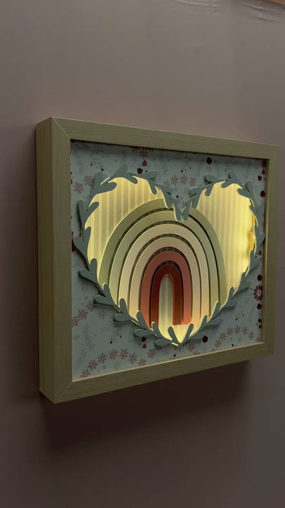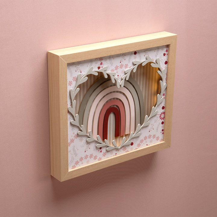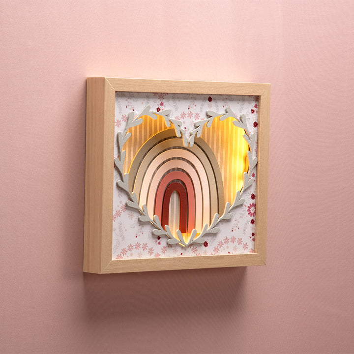A magical touch to illuminate a room with poetry. The Enchanted Rainbow Light Board is made of 100% MDF , with a delicate heart-shaped cutout filled with layers of rainbows in soft, natural tones. All of this is outlined with embossed leaves that reinforce the piece's delicacy.