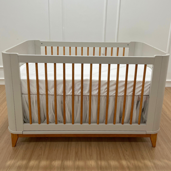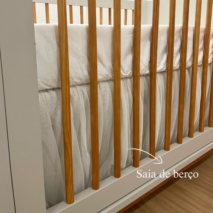 The Cream Tulle Crib Skirt envelops the room with a poetic and delicate aura, as if tiny petals danced around the crib. Made with soft layers of tulle on a polyester base , it brings movement, charm, and a charming finish to the decor.