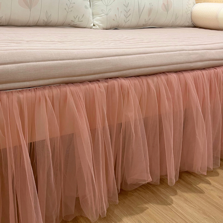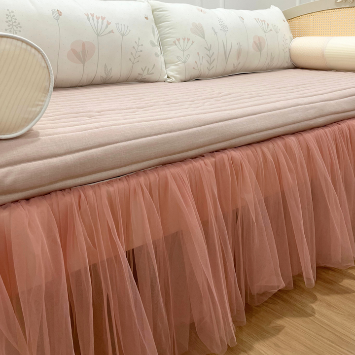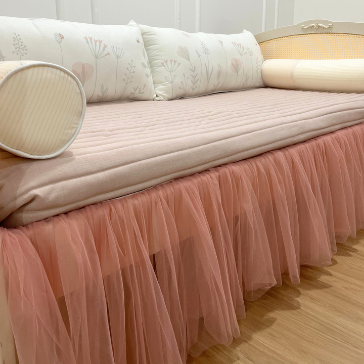As delicate as a fairy's breath, the Rosé Cloud Bed Skirt was created to bring lightness and charm to your baby's room. With its soft rosé hue, it delicately covers one side of the bed, giving an elegant and welcoming finish to the decor.