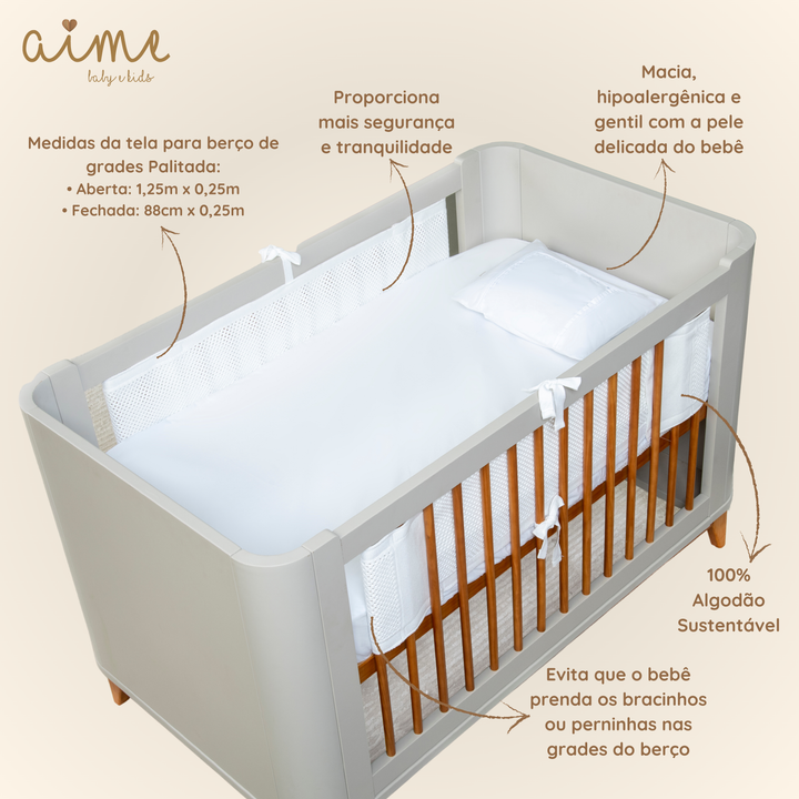 Our Breathable Flow Mesh was developed to provide greater safety and peace of mind , preventing your baby from getting their arms or legs caught in the crib rails. Made with 100% pure sustainable cotton , it's soft to the touch, hypoallergenic, and gentle on baby's delicate skin.