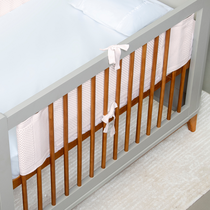 Our Breathable Flow Mesh was developed to provide greater safety and peace of mind , preventing your baby from getting their arms or legs caught in the crib rails. Made with 100% pure sustainable cotton , it's soft to the touch, hypoallergenic, and gentle on baby's delicate skin.