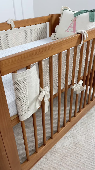 Our Breathable Flow Mesh was developed to provide greater safety and peace of mind , preventing your baby from getting their arms or legs caught in the crib rails. Made with 100% pure sustainable cotton , it's soft to the touch, hypoallergenic, and gentle on baby's delicate skin.
