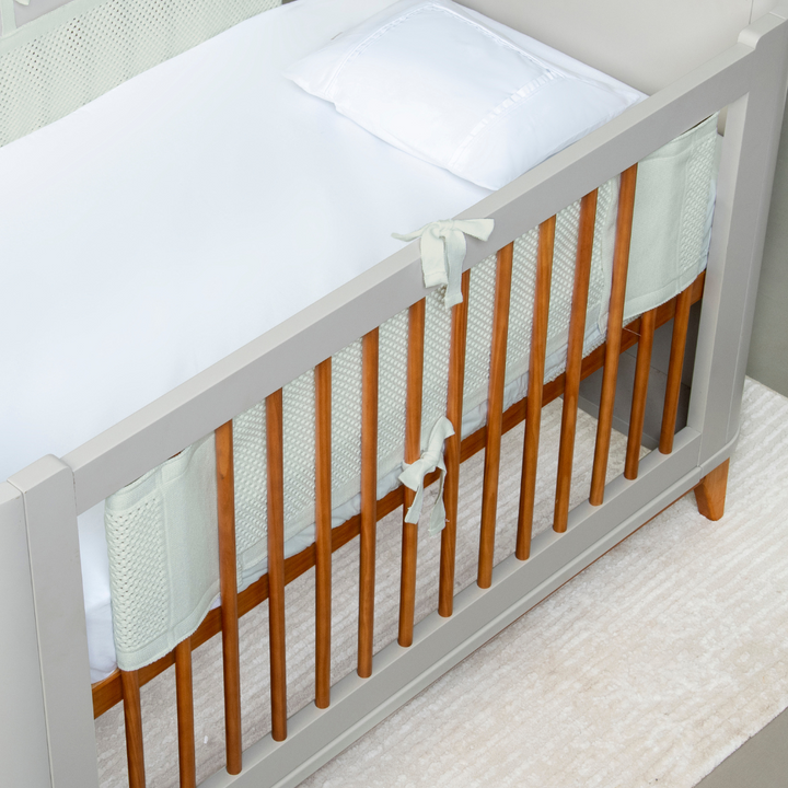Our Breathable Flow Mesh was developed to provide greater safety and peace of mind , preventing your baby from getting their arms or legs caught in the crib rails. Made with 100% pure sustainable cotton , it's soft to the touch, hypoallergenic, and gentle on baby's delicate skin.