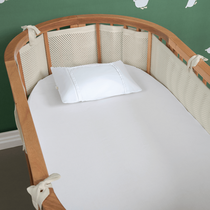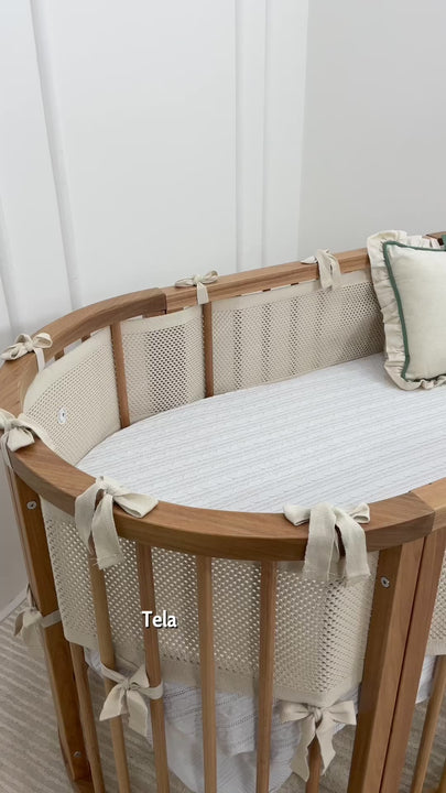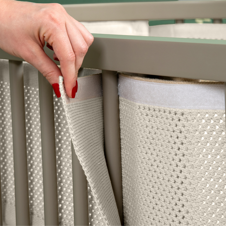 The Almond Milk 4-Sided Breathable Flow Mesh was carefully developed to provide your baby with safer, more comfortable, and peaceful nights of sleep . Made from 100% sustainable cotton , its soft texture and breathable structure prevent your baby from getting their arms or legs trapped between the crib bars, without compromising air circulation.