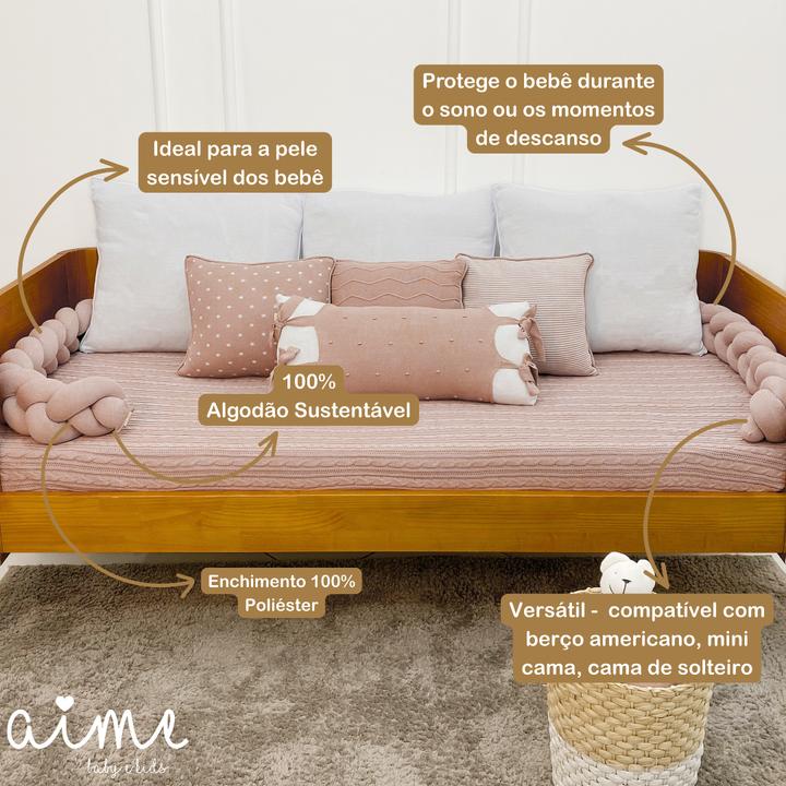 Besides being charming, the braid is extremely functional: it adapts to a crib, a single bed, or a nanny bed. Its silicone filling provides structure and comfort, while the knit is easy to wash and maintain. A piece that lasts for years and maintains its beauty and softness over time.