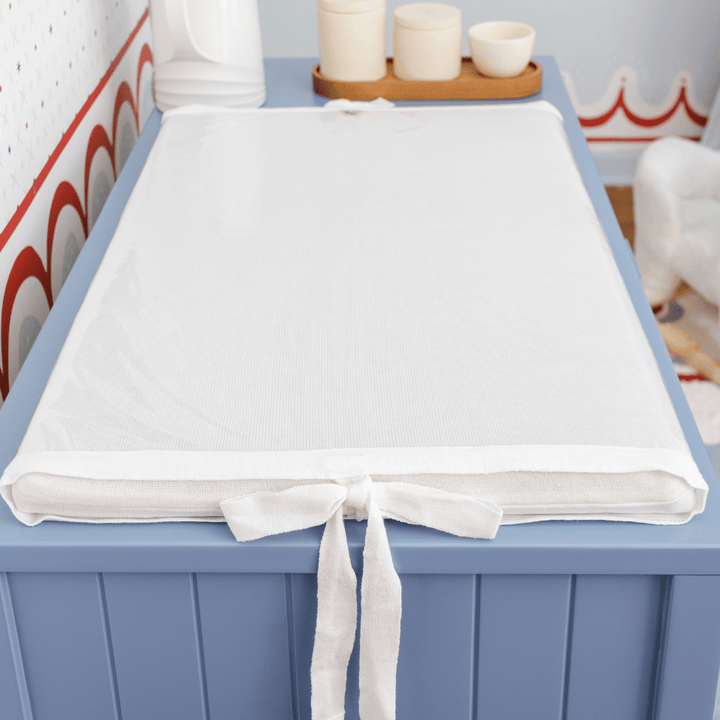 Delicate in appearance and comfortable to use, the Cream Cotton Tricot Baby Changing Mat was designed to make diaper changes a relaxing experience. Its 100% hypoallergenic cotton tricot lining provides a soft, safe touch for baby's sensitive skin.